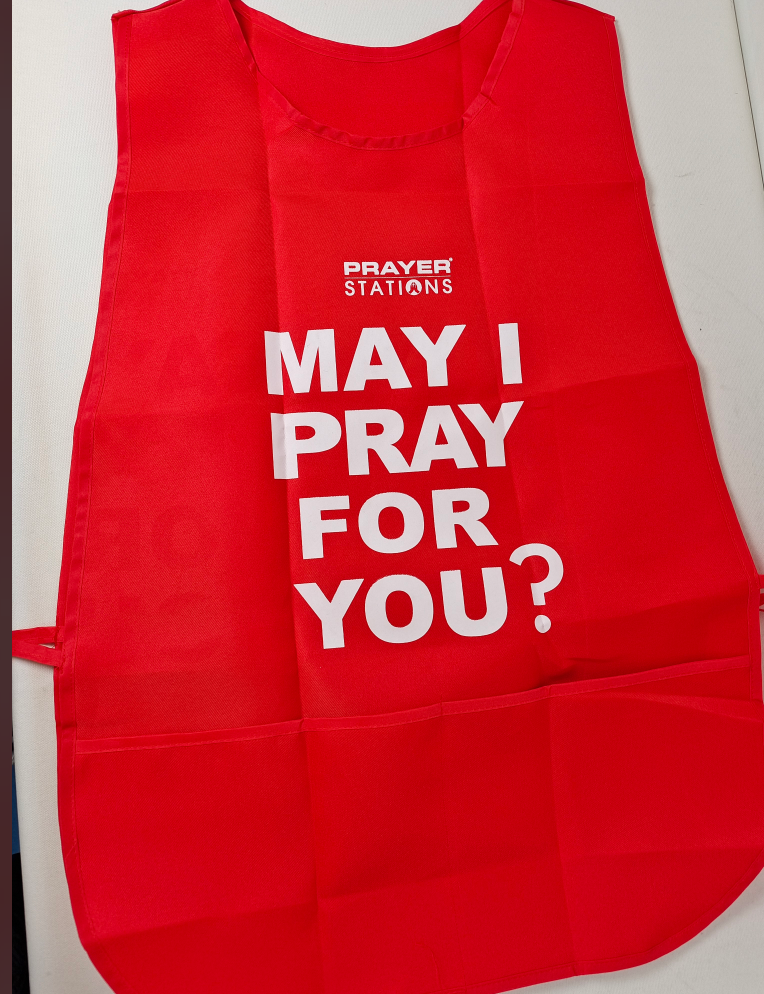The Prayer Station Apron immediately connects you with the Prayer Station! Very easy to put on and take off after you finish with ministry. It has front pockets that can hold any ministry material or personal contents during ministry time. The front and back of the apron has a large MAY I PRAY FOR YOU, which definitely brings people in for ministry time!